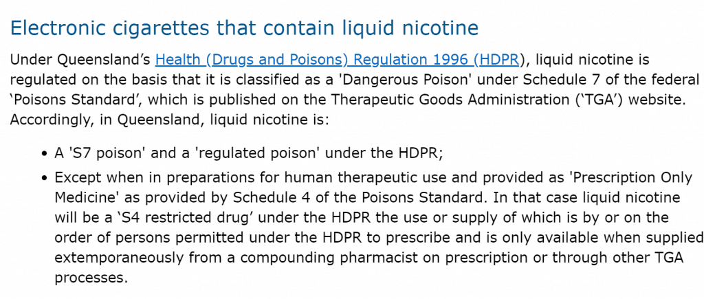 The baseline is that because nicotine is classed as a Schedule 7 poison in Australia, it’s illegal to sell it except as a licensed medication.