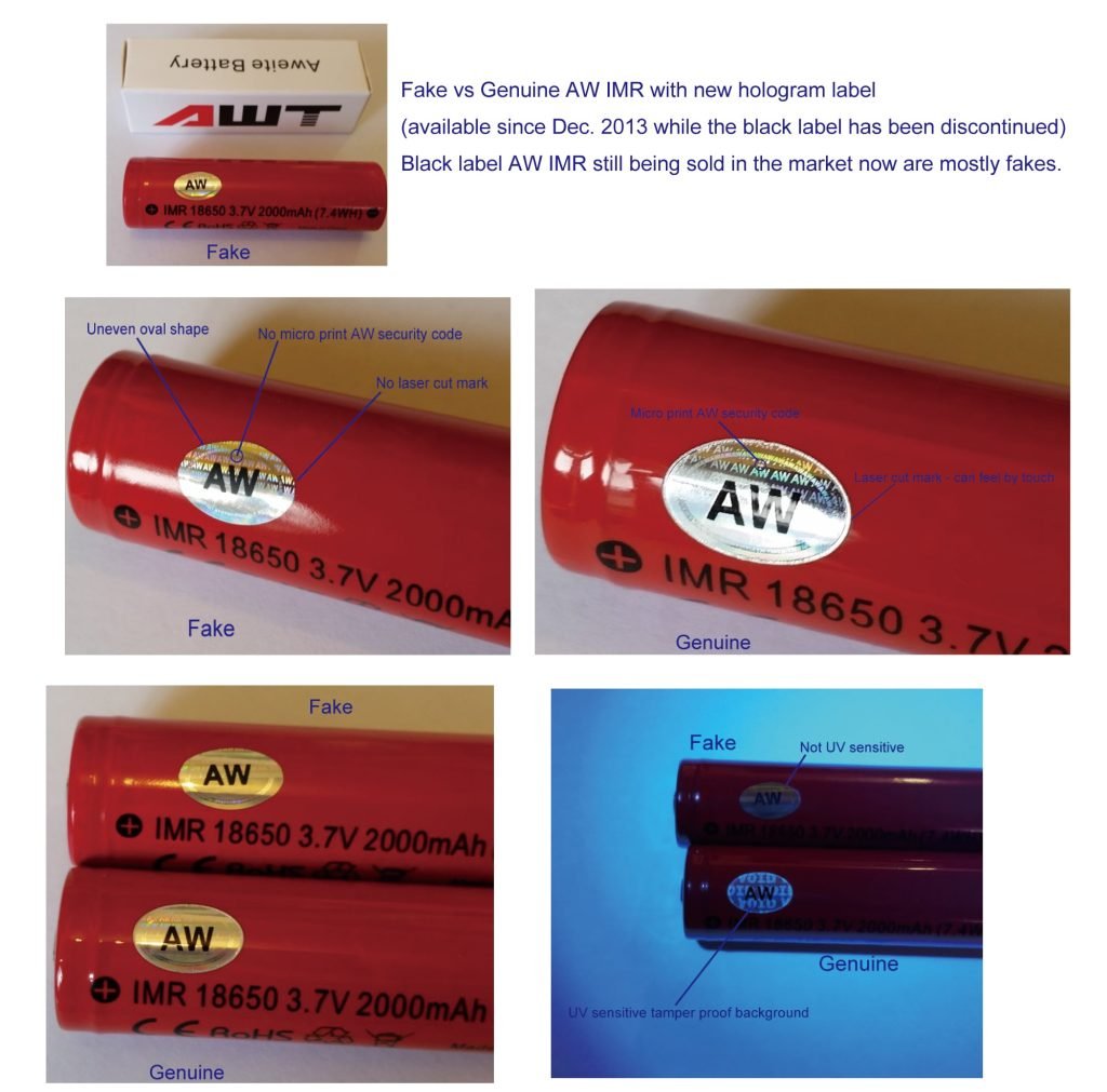 Since December 2013, all AW batteries have included a hologram label. Counterfeiters began producing this label again in May 2014, but the copies were not exact. A genuine AW hologram label is UV-reactive and glows in UV light; counterfeit labels do not glow under UV light.